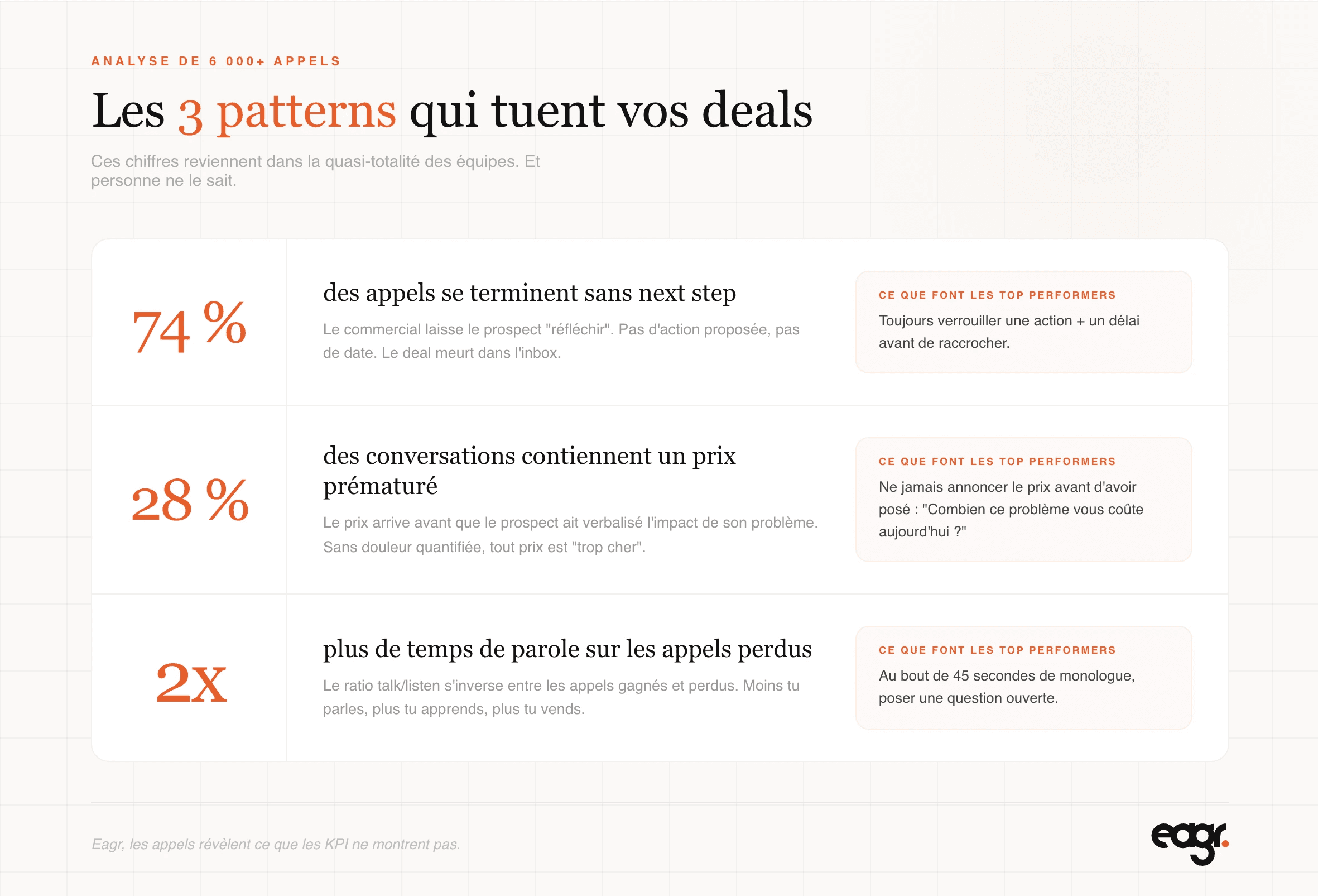 Le problème ? Ces comportements sont inconscients. Ils ne se transmettent pas. Eagr les identifie et les réplique à toute votre équipe, appel après appel.