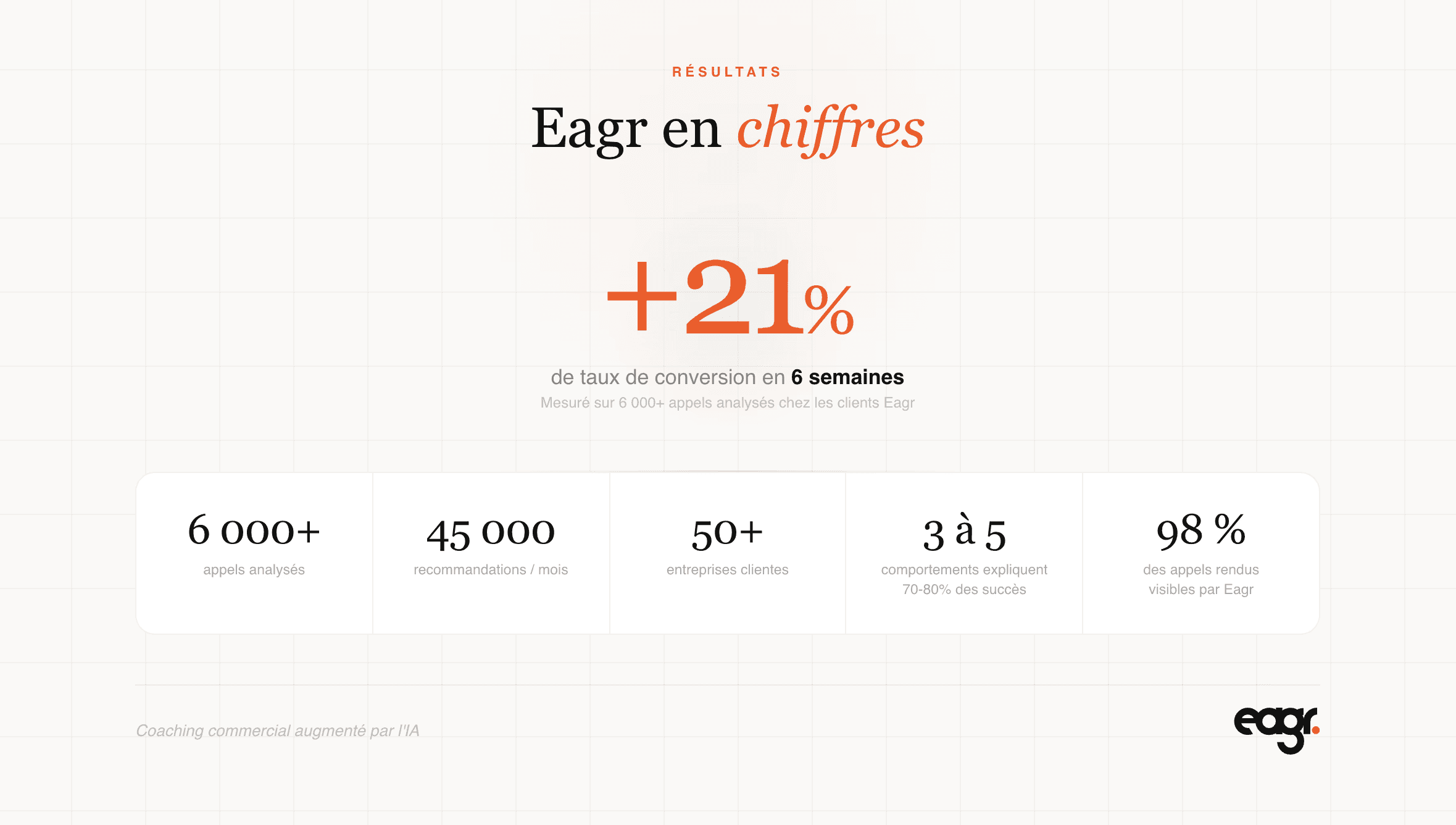 + 21 % de taux de conversion en moyenne en 6 semaines, mesuré sur plus de 6 000 appels analysés chez les clients Eagr.
