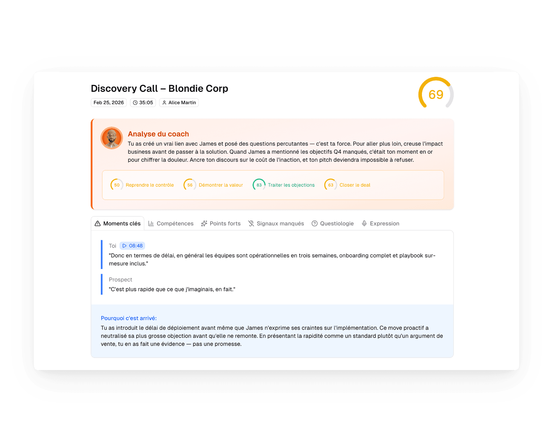 Les moments clés repèrent la seconde exacte où un deal a basculé - ce qui a fonctionné, ce qui a été raté, et pourquoi. Chaque explication est accompagnée d'une alternative concrète que le commercial aurait pu utiliser.