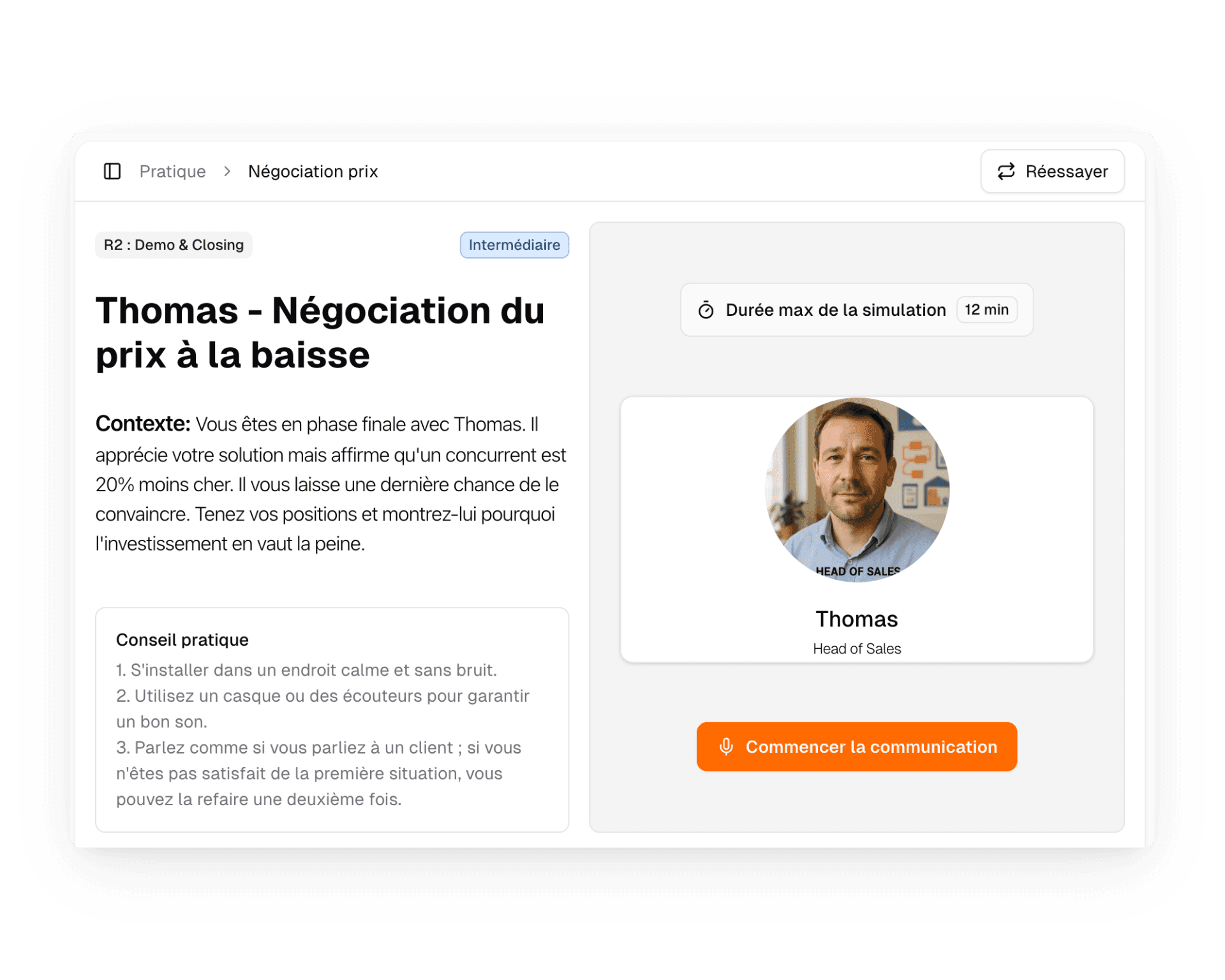 Des roleplays IA construits à partir de vos vrais profils d'acheteurs - chacun avec sa personnalité, ses objections, et un niveau de difficulté ajustable. Vos commerciaux s'entraînent sur les conversations qu'ils auront vraiment, pas sur des simulations génériques.