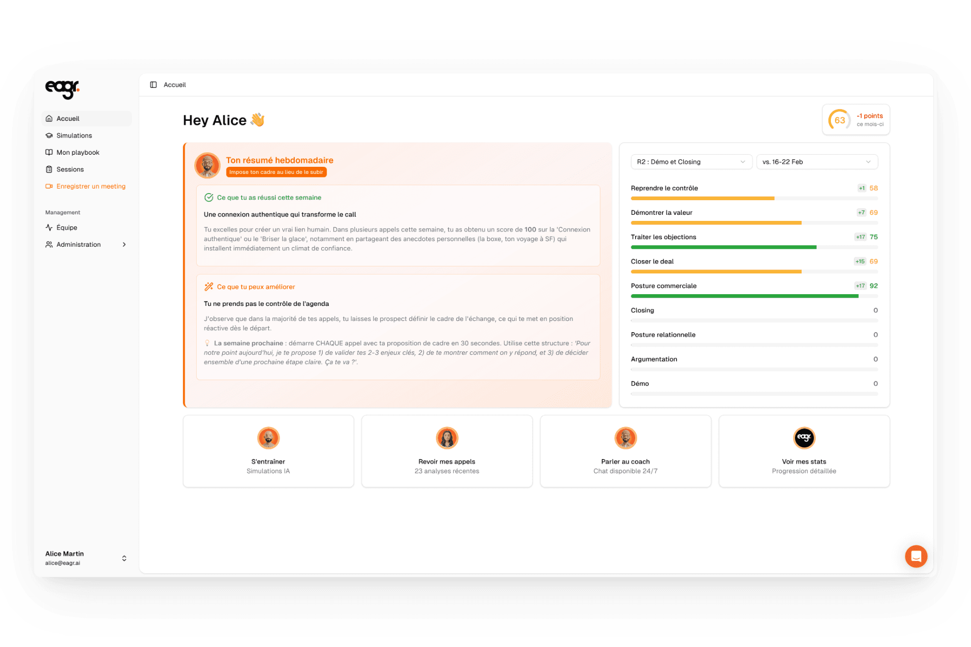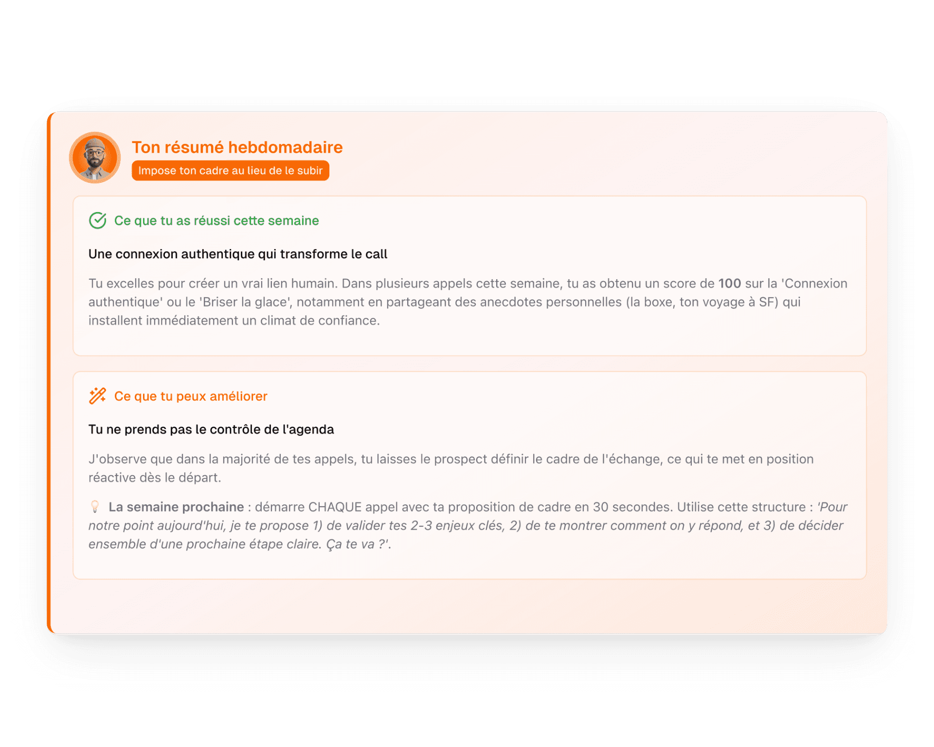 Après chaque session, un débrief complet : un score par compétence du playbook, une cartographie des forces et des axes de progression, et des recommandations détaillées au niveau de la technique - comme "ta question d'ouverture était trop hésitante, voici une meilleure alternative."